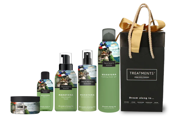 Once a year, the valleys in the Himalayas bloom for just a week. The small purple flowers spread a sweet spring-like scent. Treatments® has translated this scent with, among other things, the scent of lilac hyacinths and the spicy undertones of musk and sandalwood , which reflect the mystical spring-like scent from Bhutan.