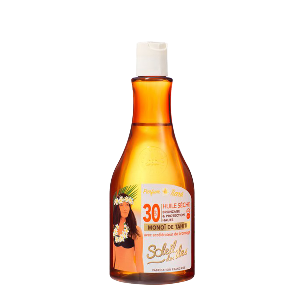 Rich in monoi de Tahiti and tanning accelerator, your tan will be faster, intense but natural and happen gradually; your skin remains golden for longer and is effectively protected against the sun's rays (UVA and UVB)