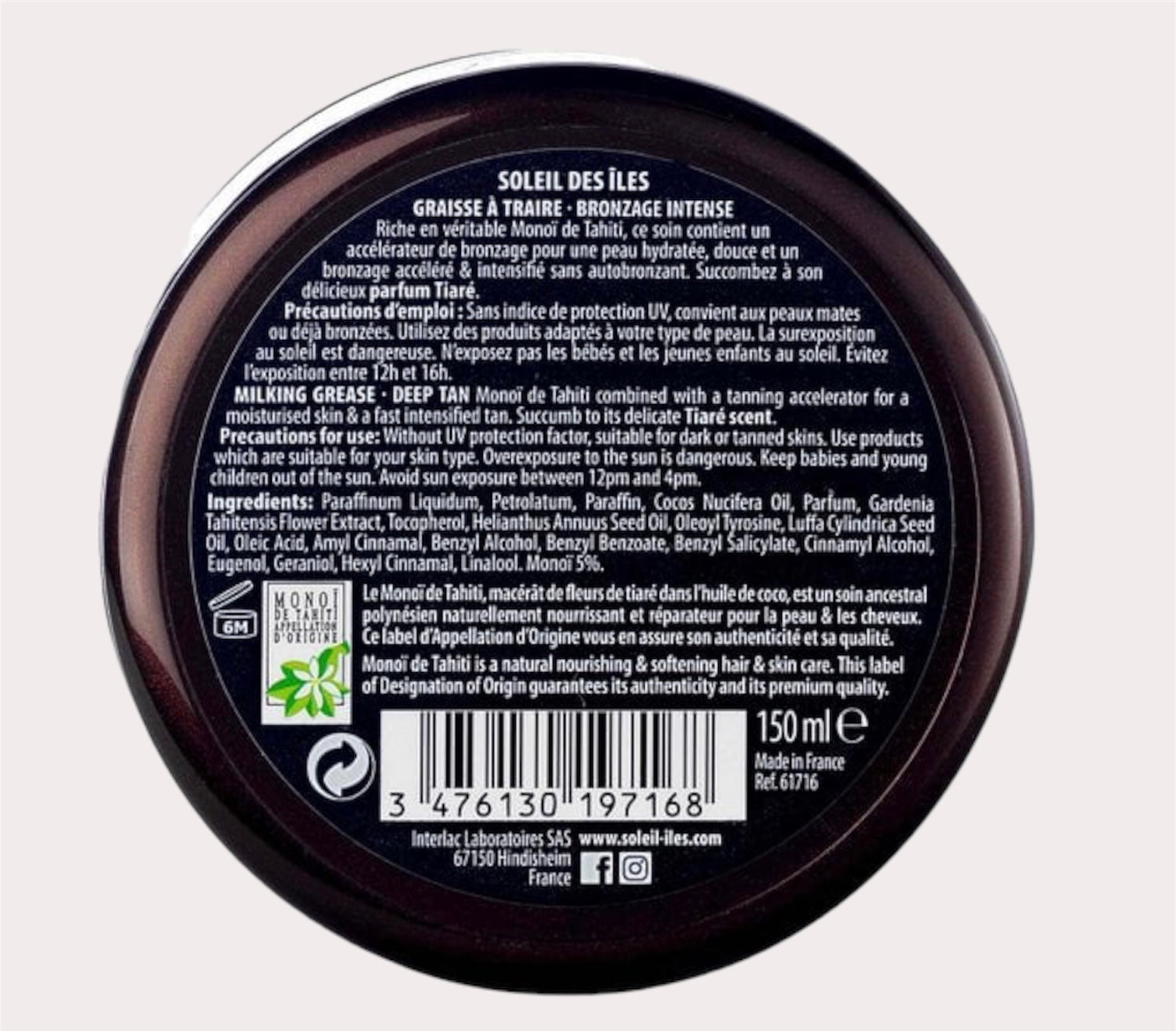 This milk fat, rich in real Monoi de Tahiti and tanning accelerator, is intended for sun worshipers. It hydrates the skin and intensifies the tan for a radiant and satiny effect. Nicknamed "the Queen of Polynesia", the Tiare flower perfumes the body with a delicate scent of distant islands.