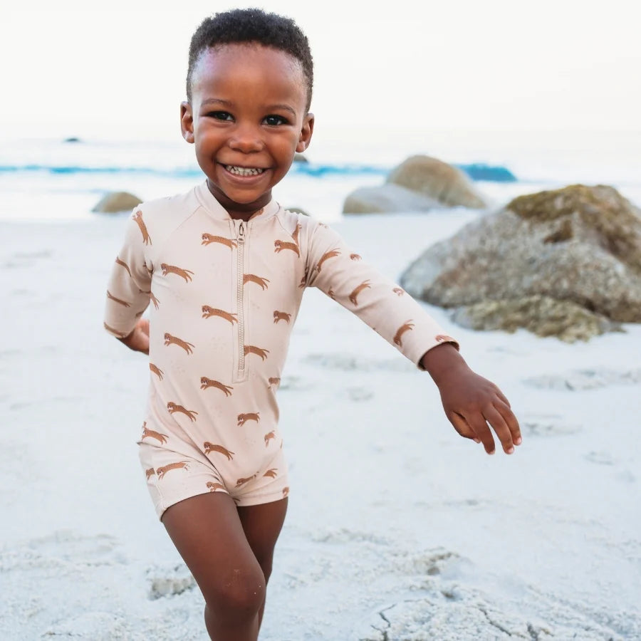 Let op valt klein! Het leukste zwempak voor de echte dieren fan! Dan is dit zwempak met lange mouwen in Brown Leopard Animal print helemaal voor hem! De opvallende print zorgt voor een stoere look, terwijl de UV-werende stof optimale bescherming biedt tijdens zonnige dagen. Perfect voor avonturiers die graag actief zijn in het water en op het strand!Het zwempak is licht, ademend en sneldrogend, waardoor je kleintje comfortabel blijft tijdens al zijn zomerse avonturen. De lange mouwen bieden extra bescherming, zodat je zorgeloos kunt genieten van zonnige dagen.Waarom dit zwempak een topper is:• Brown Leopard print voor een stoere uitstraling• UV bescherming voor extra veiligheid onder de zon• Sneldrogend en ademend voor langdurig comfort• Duurzaam en stijlvol door gerecycled materiaalLaat je kleine avonturier in stijl op verkenning gaan met dit coole zwempak!
