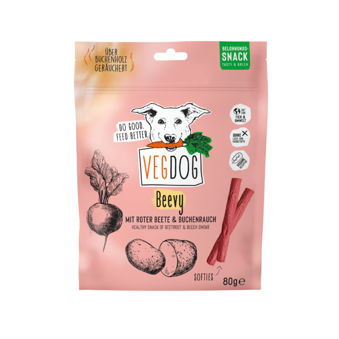 VEGDOG BEEVYS - the jackpots for your gourmet with beet and beech smoke. They impress not only with their taste, but also with their special aroma! Due to the easy breaking at the notches, it can also be used excellently for training. A real super snack!