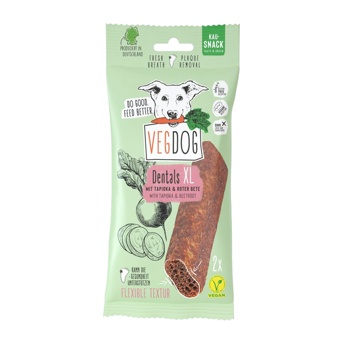 Om ervoor te zorgen dat de tandheelkundige zorg voor onze viervoeters prettig, lekker en tegelijkertijd effectief is, hebben wij bij VEGDOG de XL-DENTALS ontwikkeld. De stokjes van rode biet en tapiocameel zorgen voor lang kauwplezier en zelfs grotere honden hebben echt iets om aan te knabbelen. Dat dit zo fantastisch werkt komt door de sponsstructuur van de XL-DENTALS. De cellulose die het bevat, werkt als een peeling en verwijdert tandplak van tandoppervlakken. Als je harige vriend met smaak op onze XL-DENTALS kauwt, wordt het tandvlees gemasseerd, wat zorgt voor een goede doorbloeding.