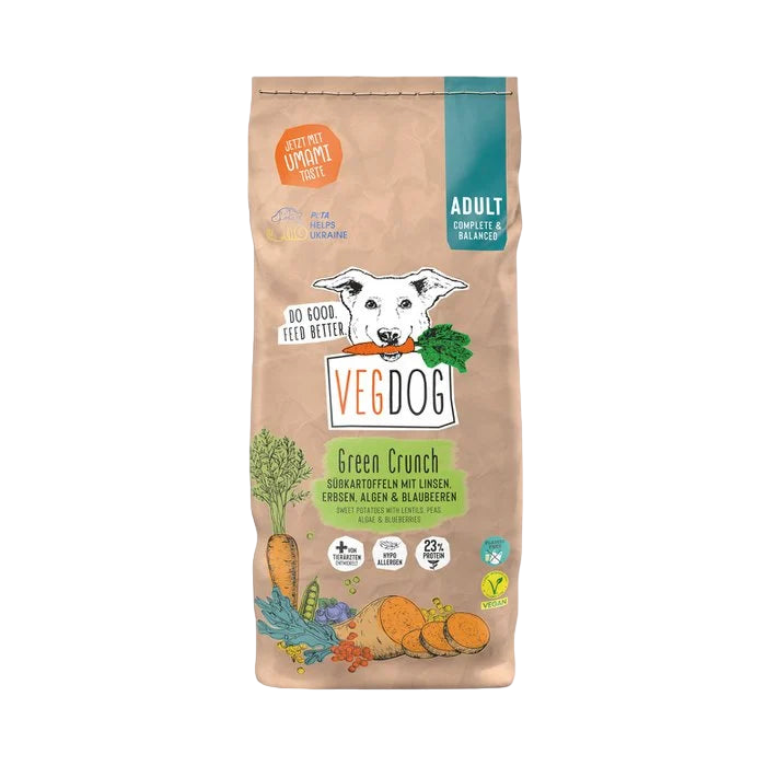 VEGDOG GREEN CRUNCH droogvoer is een volledige, volwaardige voeding voor volwassen honden vanaf 12 maanden (afhankelijk van ras en grootte) en biedt een gezonde afwisseling in het voedingsschema. Het is goed verteerbaar en bevat alternatieve eiwitbronnen, waardoor het ook geschikt is voor gevoelige honden en als uitsluitingsdieet.