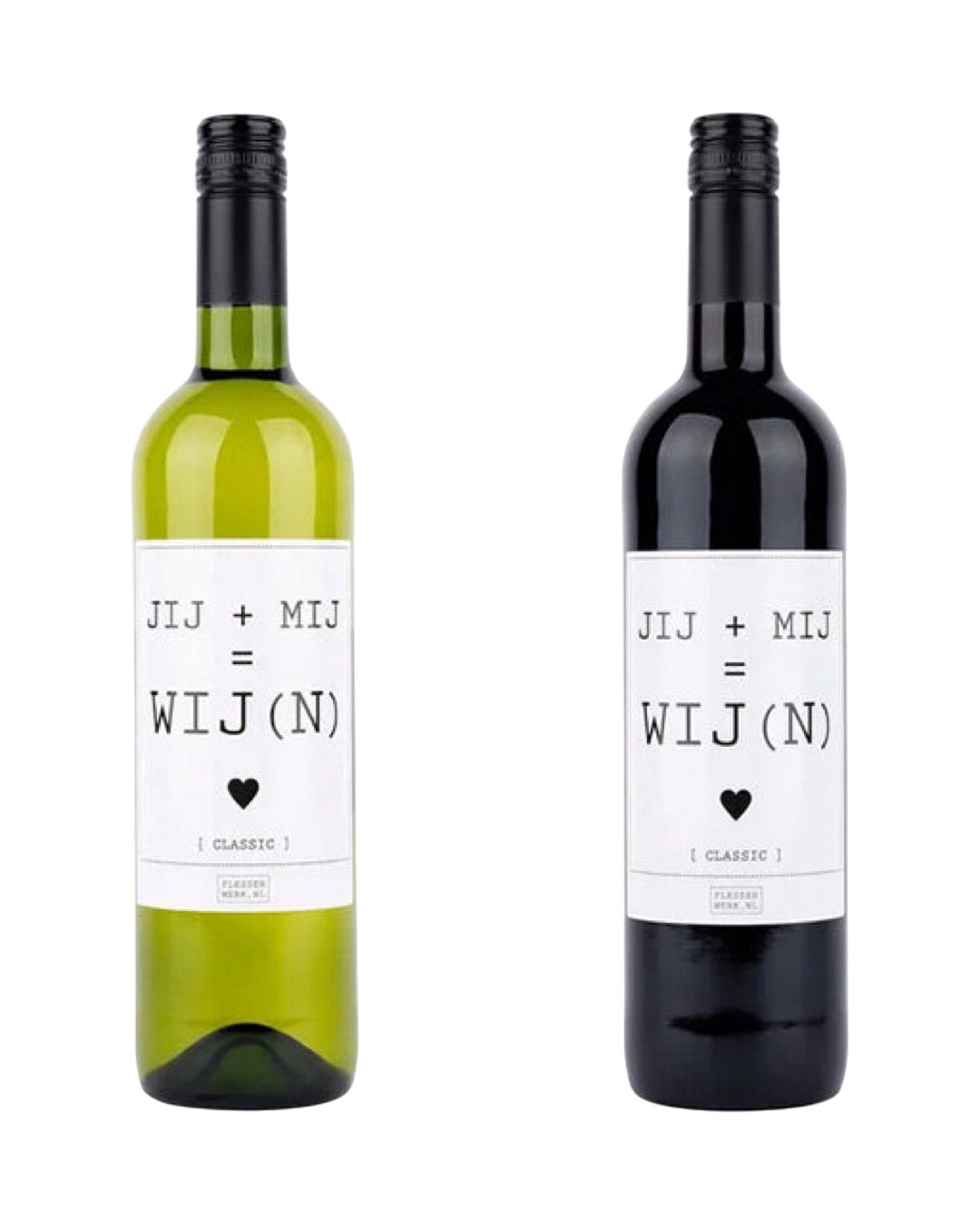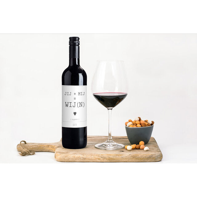 Een super leuke fles witte of rode wijn met wit etiket en tekst 'Jij + mij = wij(n)'. Het perfecte kado om te geven.