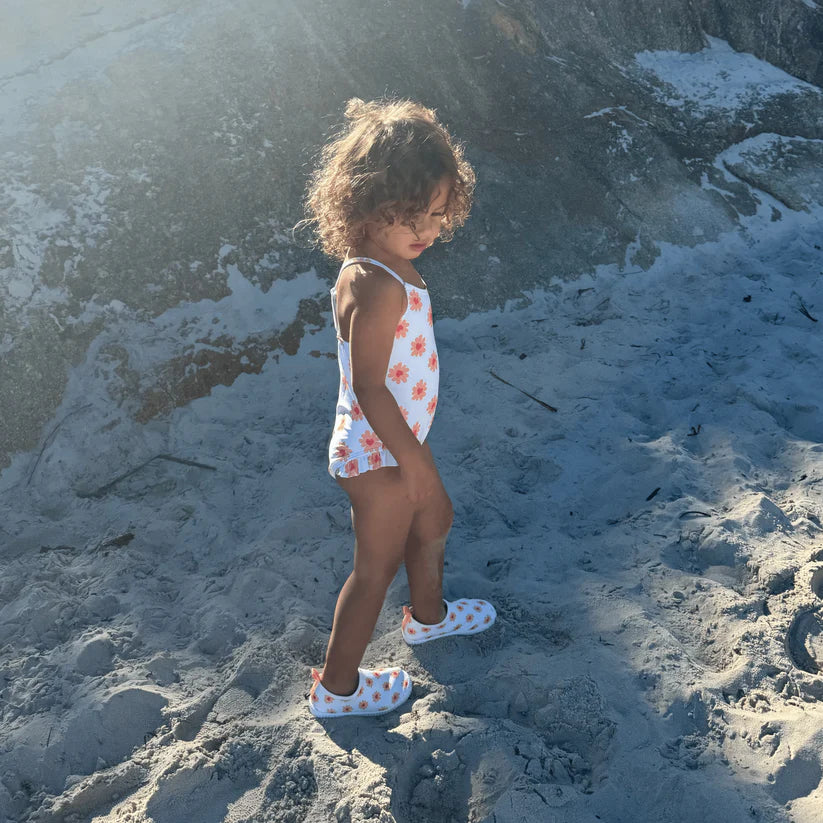 Combineer deze waterschoentjes nu met andere items uit onze Flower Hearts collectie. Mix en match en stel zo de perfecte zomeroutfit samen voor je kleintje. Je vindt de Flower Hearts print terug op onze UV badpakken, UV Bikini’s, poncho, zwembandjes en UV zonnepetjes en hoedjes.