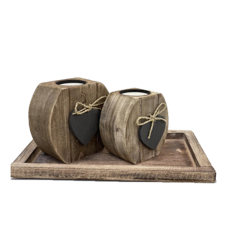 Woodart Waxinehouder Set Hart 2x op Onderschaal Naturel